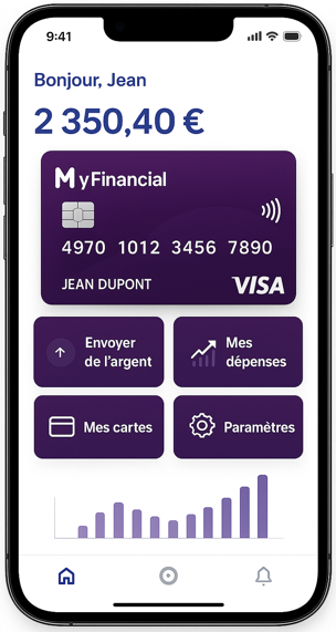 Myfinancial Bank Une expérience bancaire fluide, ou que vous soyez. Simplifiez votre vie financière avec un compte 100 % digital, sécurisé et accessible en quelques minutes. Demander un crédit Transparente, rapide et sans frais cachés. On vous redonne le contrôle sur votre argent. + 0 k Utilisateurs Satisfaits 0 € Offert à l'ouverture 0 Frais à l’étranger 0 J/7 Support client Myfinancial Bank Banque moderne Chez Myfinancial Bank, nous avons repensé chaque détail pour rendre la banque plus simple, plus rapide et plus transparente. Compte courant instantané Ouvrez votre compte en quelques minutes et recevez un IBAN français sans frais cachés. Carte Mastercard gratuite Payez partout dans le monde, sans contact et sans commissions inutiles. Crédits flexibles et accessibles Financez vos projets personnels, auto ou maison en quelques clics. Épargne et sous-comptes Comptes rémunérés, arrondis automatiques, objectifs d’épargne. Nos Solutions De Crédit Chez Myfinancial, financer vos envies n’a jamais été aussi simple. Crédit immobilier Profitez d’un financement sur mesure pour l’achat ou la construction de votre logement, avec un accompagnement 100 % digital et transparent. En savoir plus Crédit auto Profitez d’un financement sur mesure pour l’achat ou la construction de votre logement, avec un accompagnement 100 % digital et transparent. En savoir plus Crédit personnel Voyage, travaux, équipement… Profitez d’un prêt à taux attractif, sans frais cachés et gérable entièrement en ligne. En savoir plus Choisissez la carte Myfinancial qui vous ressemble Gérez toutes vos cartes depuis la plateforme Myfinancial Bank.Suivez vos dépenses, changez de formule en un clic et vivez une expérience bancaire sans friction. Carte Essentielle Carte Premium Carte Metal